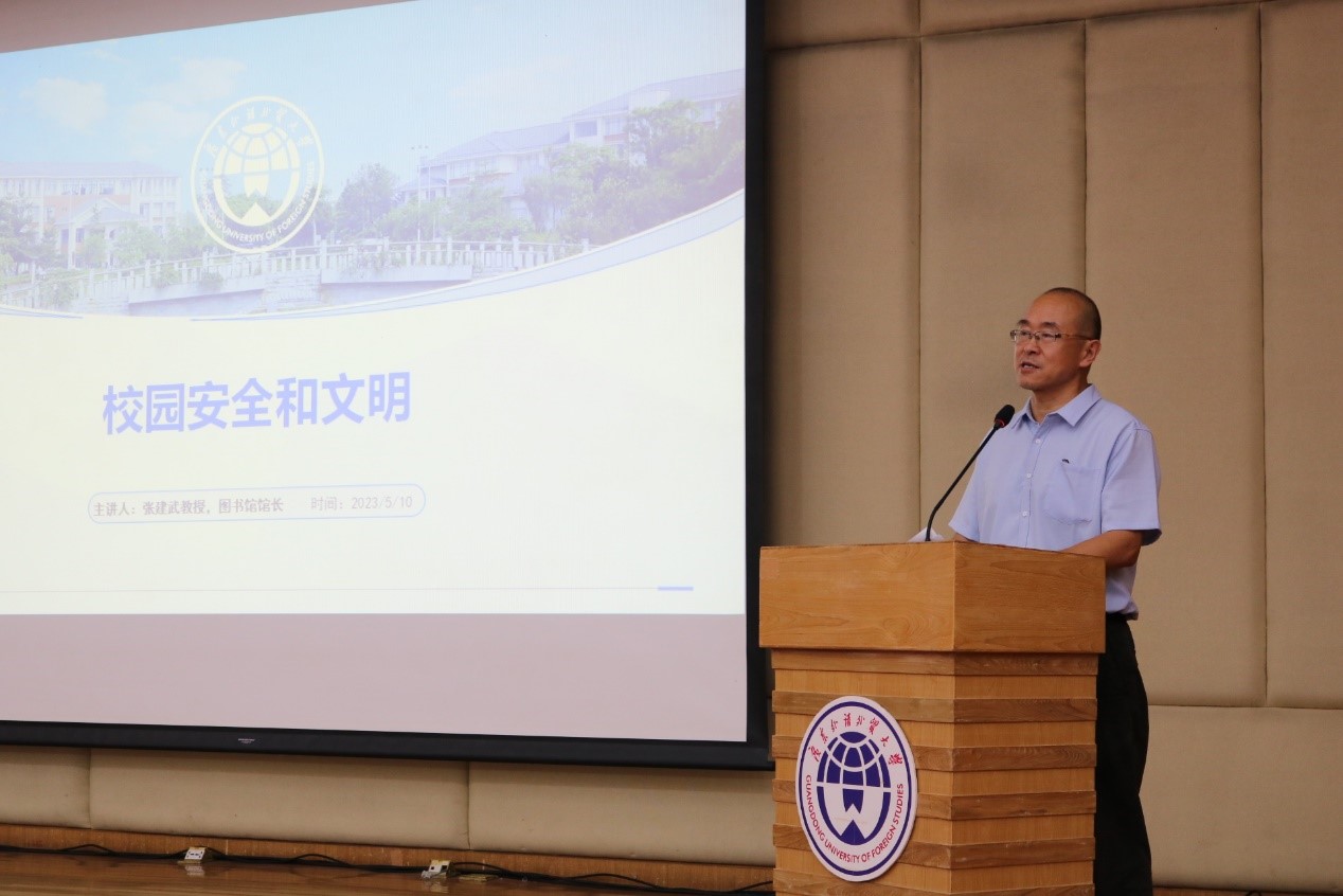 图书馆(档案馆)馆长张建武教授做了主题为“校园安全和文明”的专题培训。他结合广外“卓越、诚信、包容、自信”的价值观,从校卫队伍保障校园安全和文明中的重要作用、从师生角度希望看到怎样的校卫队伍、正确认识职业定位和工作性质、努力平衡按规办事与提供人性化服务的关系、工作中遇到对方无理取闹如何正确处理等五个方面,详细阐述了校卫队员如何提高服务意识和解决实际工作困难。
