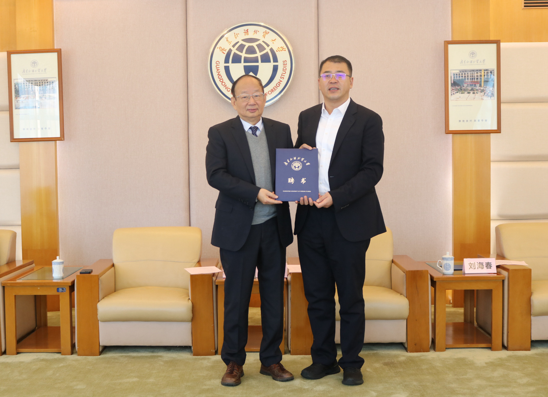 (本网讯) 11月14日上午,我校举行云山工作室首席专家聘用仪式,江西师范大学原党委书记兼校长、知名学者傅修延教授受聘我校“外国语言文学学科建设云山工作室首席专家”,校长闫相斌出席聘用仪式并为专家颁发聘书。聘用仪式在白云山校区行政楼迎宾厅举行,副校长刘海春教授主持聘用仪式,人力资源部、外国文学文化研究院等相关单位负责人参加仪式。