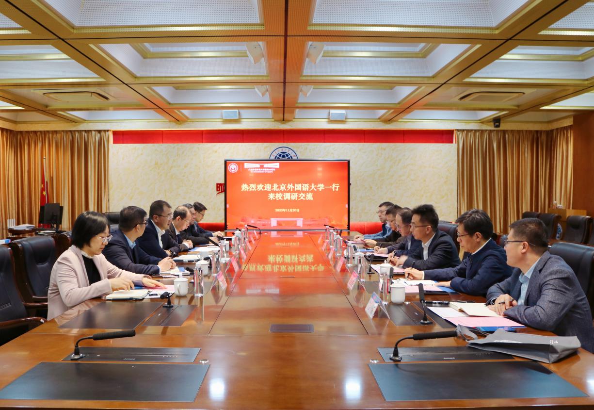 本网讯 11月20日下午,北京外国语大学校长贾文键、党委副书记苏大鹏一行来访我校调研交流。校长闫相斌出席座谈会,双方重点围绕人事、科研、“十五五”规划等事项进行深入交流。会议由校党委常委、副校长申明浩主持。