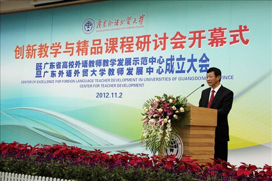 11月2日下午,创新教学与精品课程研讨会开幕式暨广东省高校外语教师教学发展示范中心、广东外语外贸大学教师发展中心成立大会于北校图书馆多功能报告厅召开。